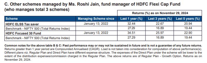 Disclaimer: Returns as on 29th November, 2024. The above returns are of regular plan - growth option. In view of the individual circumstances and risk profile, each investor is advised to consult his / her professional advisor before making a decision to invest in the Scheme. ^Past performance may or may not be sustained in future and is not a guarantee of any future returns. HDFC Mutual Fund/AMC is not guaranteeing returns on investments made in the Scheme and/or should not be construed as an advice for investing in the above stocks/sectors. The Fund may or may not have any present or future positions in the Stocks/Sectors. For complete performance details, refer pages 6. For complete portfolio details refer www.hdfcfund.com